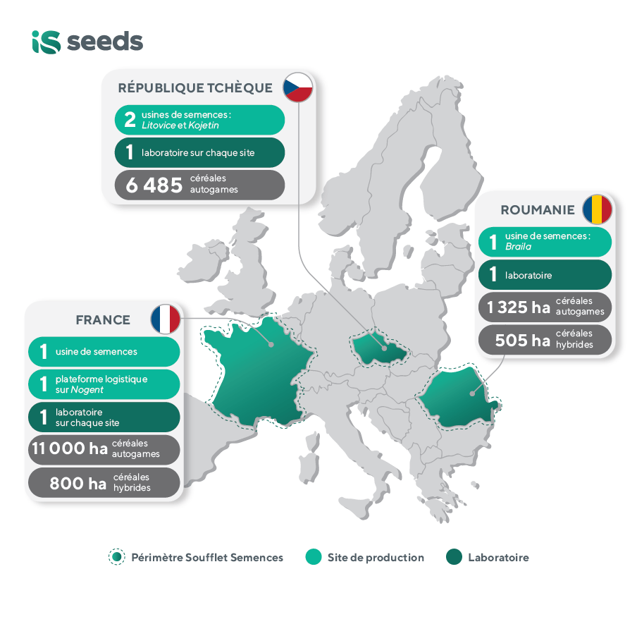 IS SEEDS exploite 4 usines à Nogent sur Seine (FR), Litovice (CZ), Kojetyn (CZ) et Braïla (RO), organise les délégations variétales et la multiplication des semences.